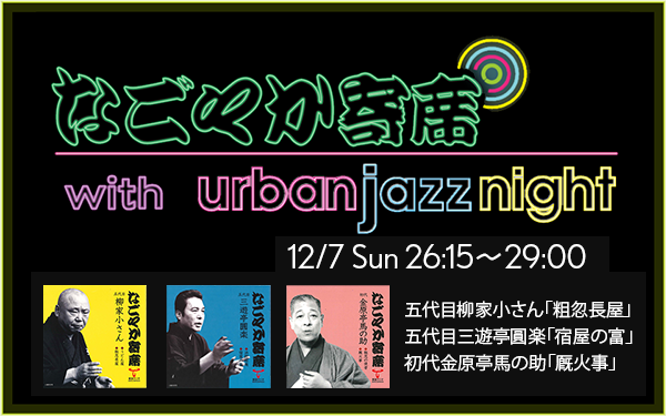 この時期恒例のTOKAI RADIOの音源からお届けする落語と選りすぐりのジャズナンバーを織り交ぜながらお届けする「なごやか寄席 with urban jazz night」。